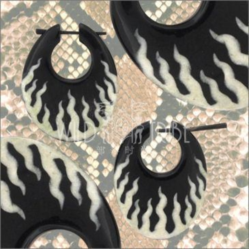 These handcarvedflaming stirrup earrings are made from water buffalo horn. The pins that secure these earrings will measure between 16g and 14g in the wearable area.