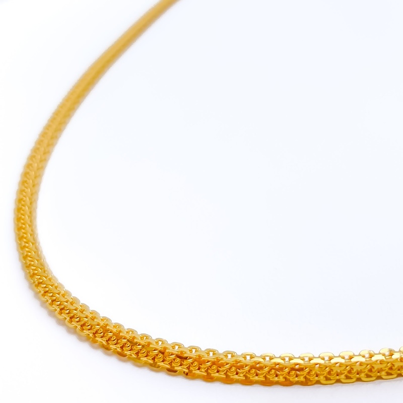 This chain is beautifully crafted from 22k yellow gold, featuring a flat double link design that combines timeless elegance with contemporary flair. Weighing 15.3 grams, it offers a blend of notable quality and comfort. The chain measures 18 inches in leng