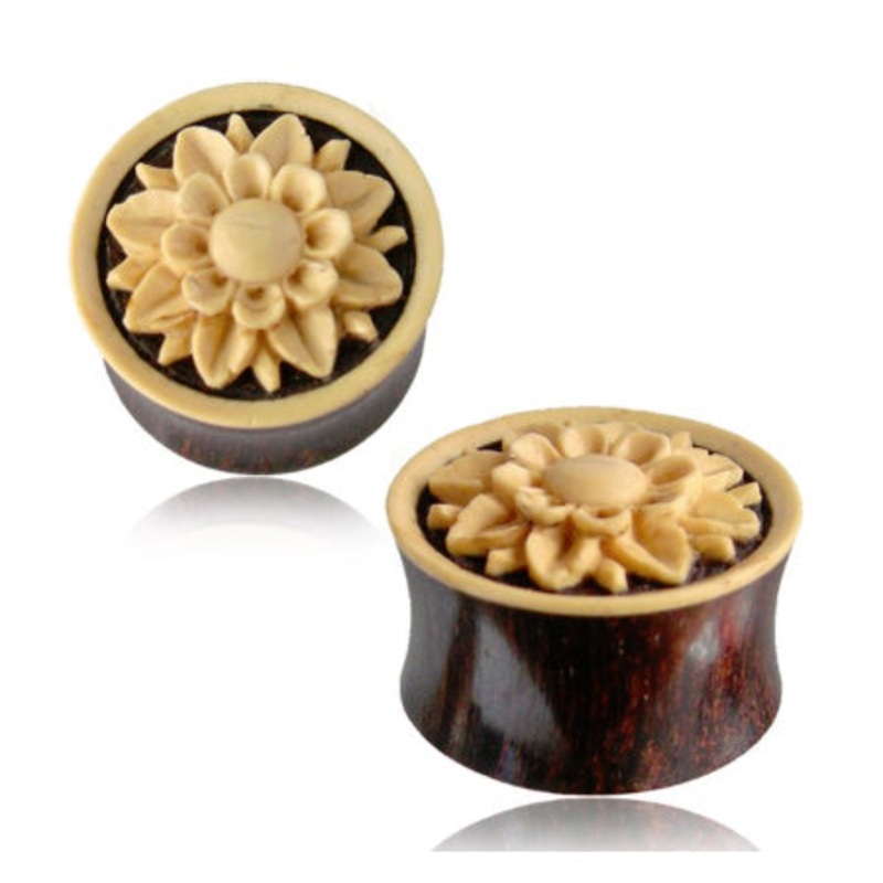 These double flare plugs are made fromtamarind wood withcarved coco-shell flowerinlay.Choose your size below.