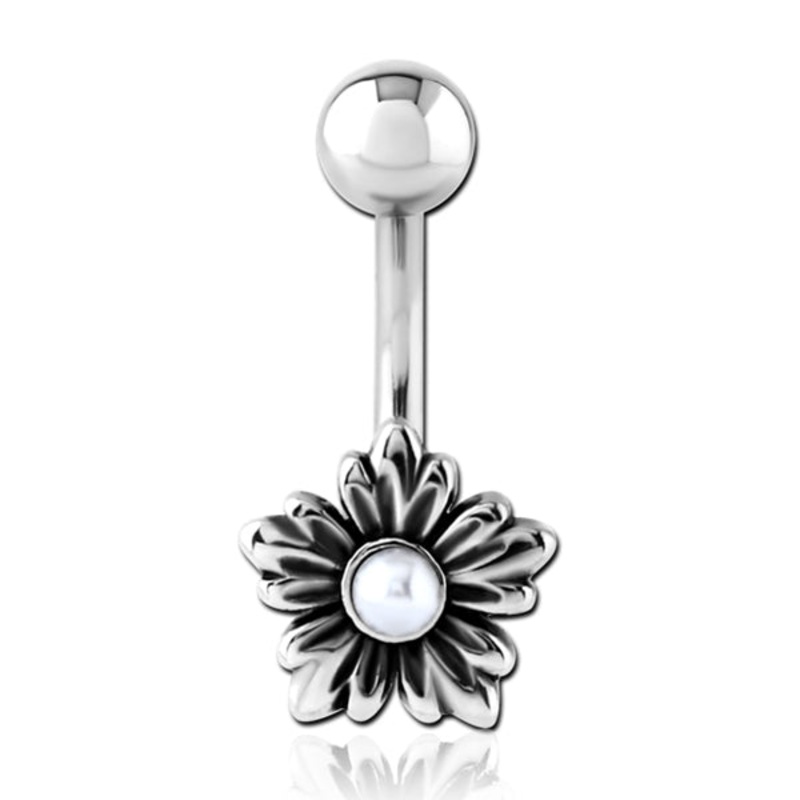 Flower Pearl Stainless Belly Ring 14g – 3/8″ long (10mm) White Pearl Stainless Steel