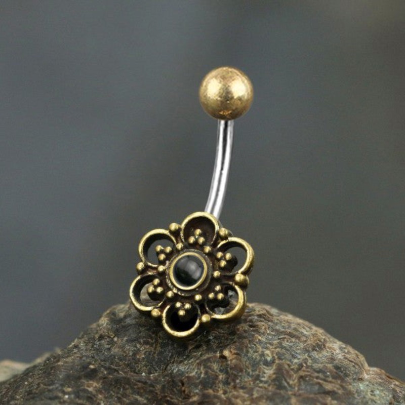 The 14 gauge flowerbelly ring ismade fromyellow brass and 316L stainless steel with external threading. The 5mm top ball is removable and the bottom is fixed. Choose your gemstone below.