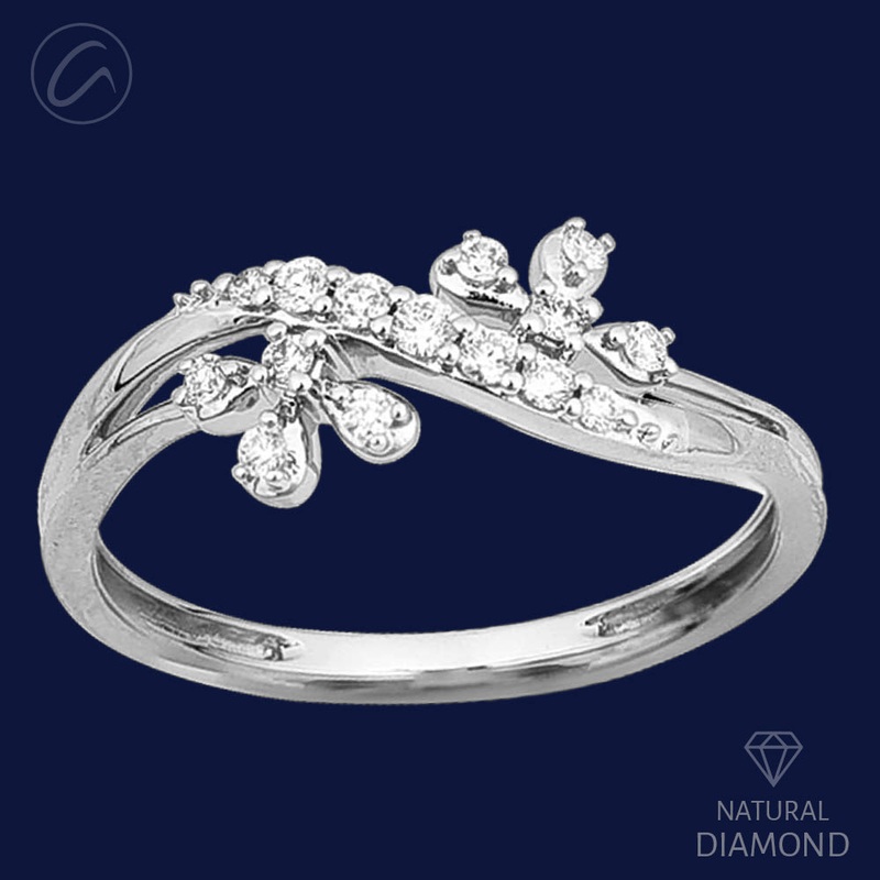 This 18k white gold ring features a flowing floral design, delicately adorned with 0.15ct of round brilliant cut diamonds. Weighing 1.8 grams, the ring showcases a sleek white gold finish and is available in a size 5.25, with sizing options. The F-G color and VS quality diamonds add a subtle sparkle, perfectly complementing the graceful floral motif. Ideal for those who appreciate nature-inspired elegance and refined craftsmanship, this ring is a beautiful blend of timeless style and delicate charm.