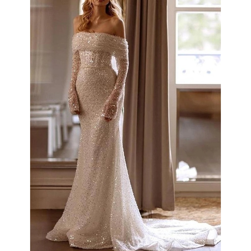 Formal Wedding Dresses Mermaid / Trumpet Off Shoulder Long Sleeve Chapel Train Sequined Bridal Gowns With Pleats Solid Color
