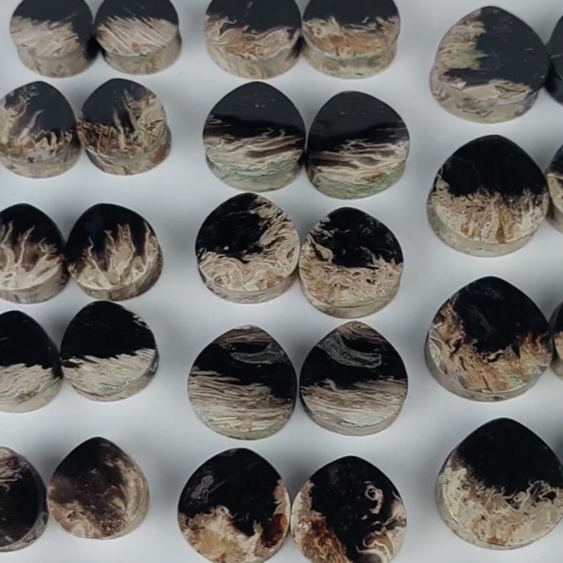 These double flare teardrop plugs are carved from Fossilized Palm Root with a flat face on both sides and wearable area of 3/8" between flares. Each pair is unique and will differ from the product photo, but we can always send a pic of yours before shippin