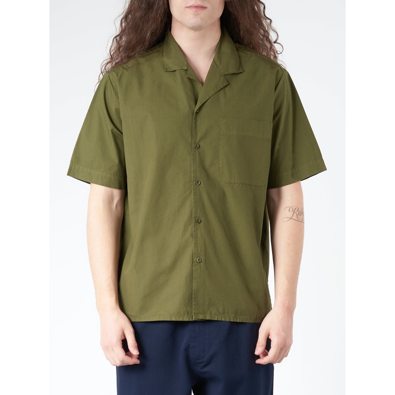 This camp-collar shirt features a single chest patch pocket and is made of lightweight cotton. It is designed with an easy, slightly oversized fit.