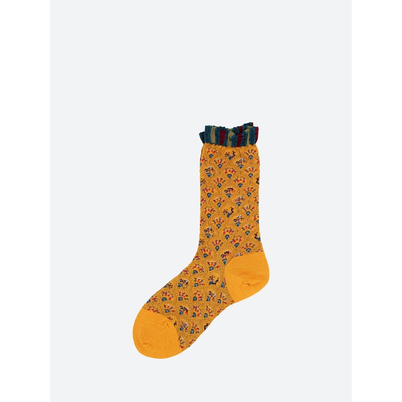 Antipast crew length socks with overlapping floral printed fans. Finished with a striped ruffle at the cuff.Crew lengthStriped ruffle cuffTonal heel and toeMaterialsFabric Content: 70% wool, 30% nylonMade in JapanSize GuideOne size fits most.For additional