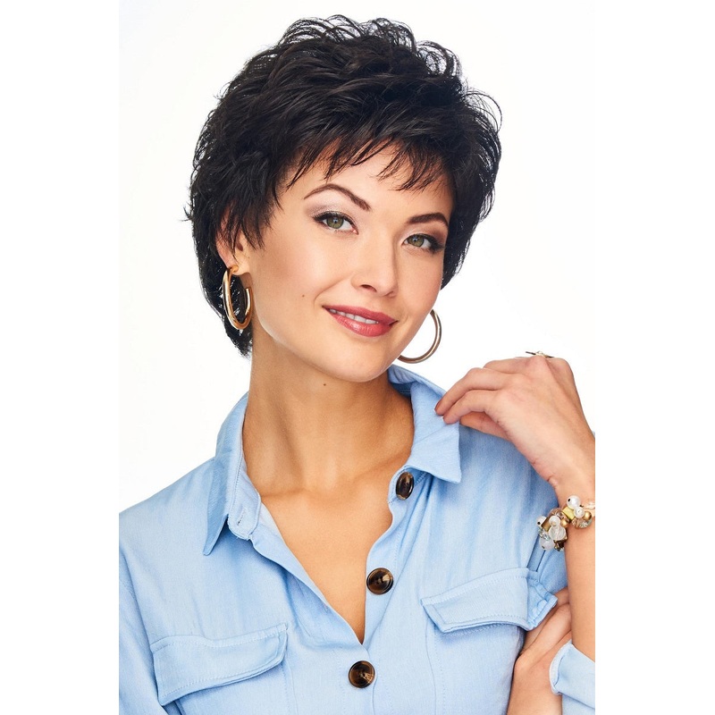 A short shag style wig featuring slightly waved all over layers that fall to a collar length nape. Features include an inside "hidden" weft for a natural hairline, open ear tabs, and an open extended nape.Suitable for Oval, Square, and Pear face shapes.Len