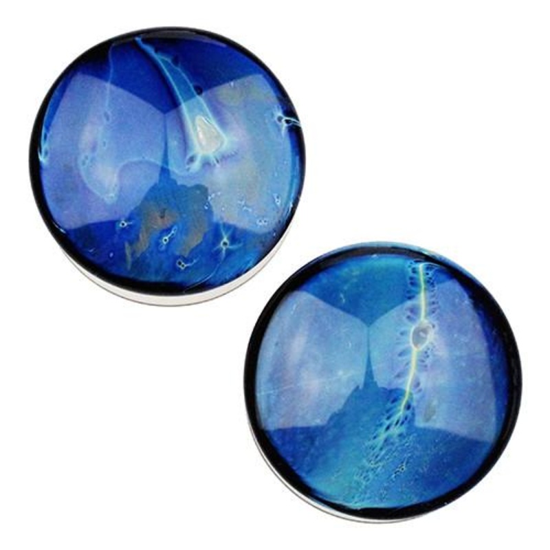 These double flare gaia plugs are made from hand blown borosilicate glass by Glasswear Studios. They can be worn backwards to show the plain glossy black side. Choose your size below.