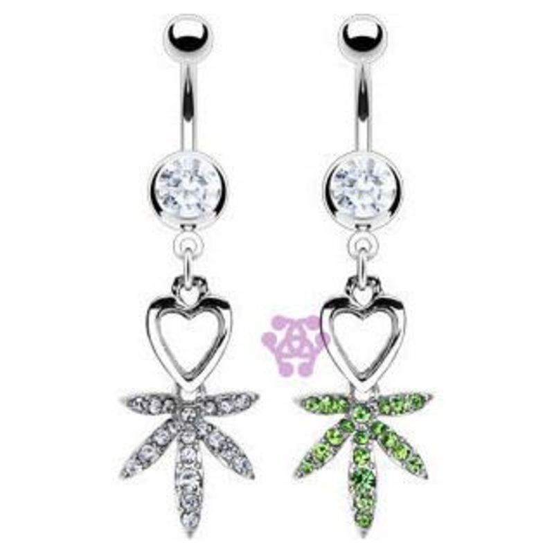 The 14 gauge ganja love dangle belly barbell is made from externally threaded 316L stainless steel. Only the 5mm ball end is removable Choose your gem color below.