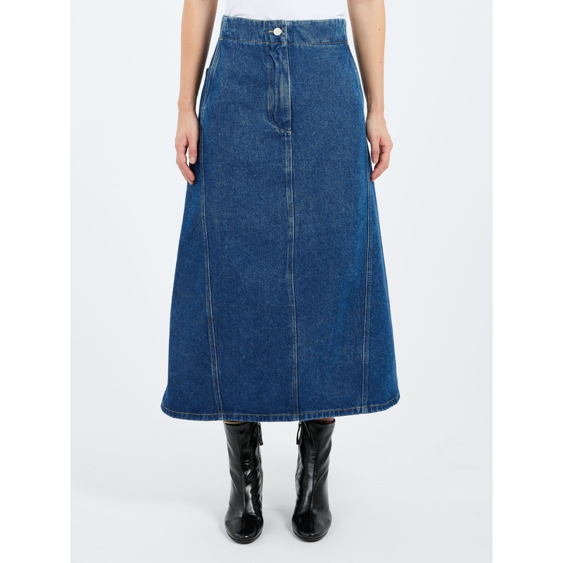 Studio Nicholson Garner A-line skirt with long lines and plenty of movement. Made from a 14 oz. regenerative denim.Mid-riseZip-fly and button closureFront-travelling seams detailTwo side entry pocketsTwo rear patch pocketsLower calf lengthMaterialsFabric C