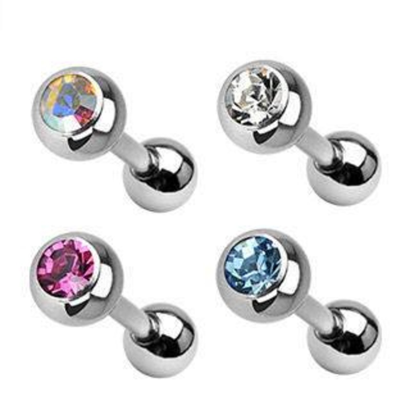 The 16 gauge cartilage barbell is made from 316L stainless steel with external threading. Only one of the balls has a bezel set cz gem. Both 4mm balls are removable. Choose your gem color below.