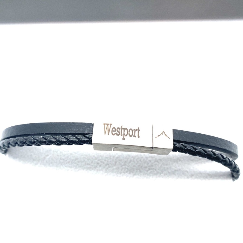 Expertly crafted with a sleek design, this gents leather bracelet combines traditional charm and contemporary flair. Emblazoned with a Westport engraving, this bracelet is constructed from sturdy double row of stainless steel.