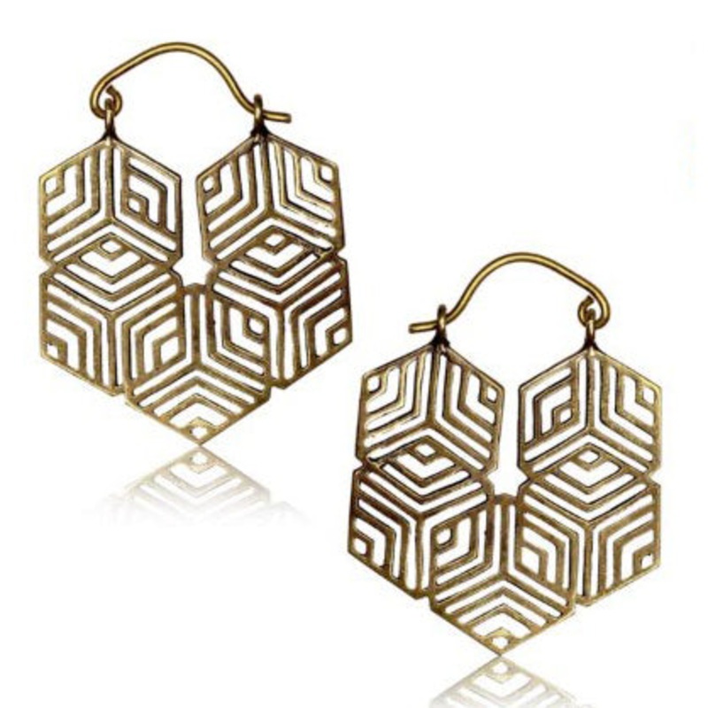 These 18 gauge geometry hex earrings are cast from solidyellow brass and approximately 43mm high x 36mm wide.