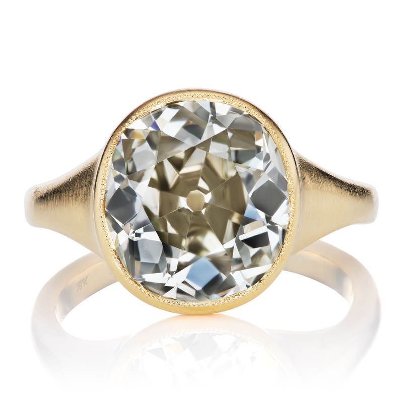 TheGeorgie 6.04 ring is an AB original design made right here in NYC. The ring centers a GIA-certified 6.04-carat oldmine cut diamond ofU-V color,SI1 clarity. The stone is bezel set in achunky 18kt yellow gold setting. The ring is currently size7.5 and can be resized!