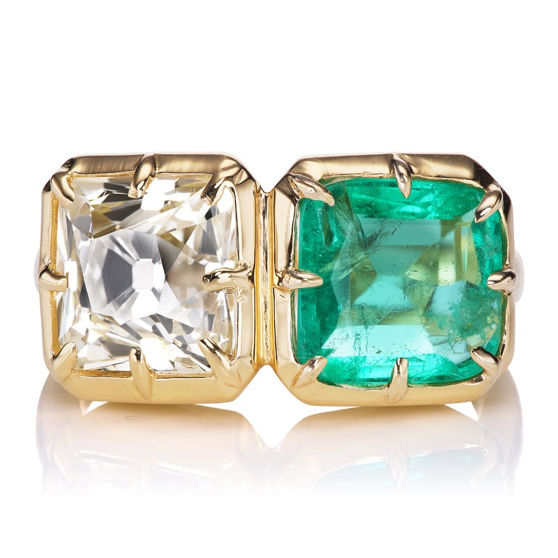 This dreamy toi-et-moi is a dazzling display of two gorgeous stones: a uniquely faceted old mine/Peruzzi cut with just the right hint of warmth and a luminous green emerald with that quintessential Colombian tone. It is a true labor of love to find two stones that coordinate well, and we feel these two are a perfect match, coming together to make a piece that is just as chic as it is romantic in buttery, chunky gold.