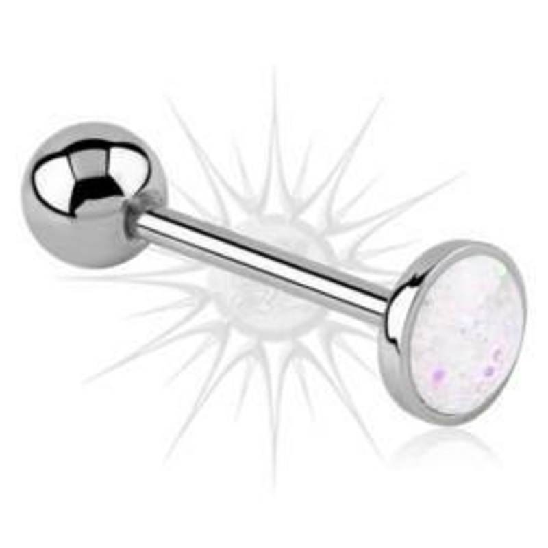 The glitter tongue barbell is made from 316L stainless steel with external threading. The 14 gauge barbell is 5/8" long with 8mm glitter top and 5mm removable ball. Choose your color below.