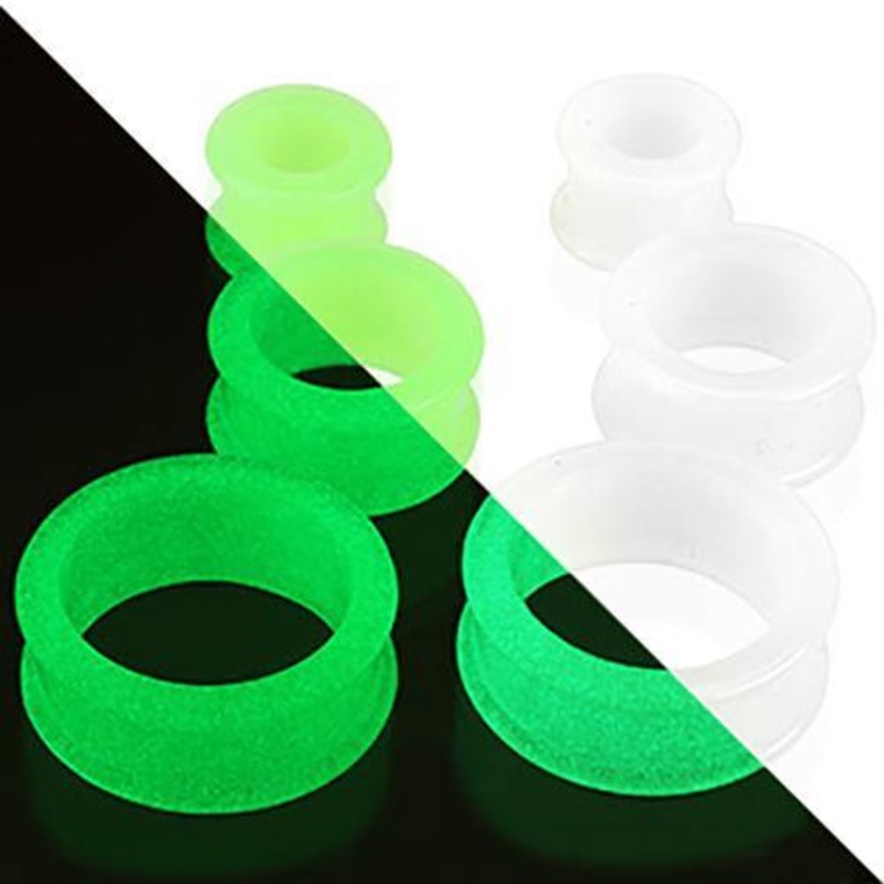 These double flare tunnels are made from glow-in-the-dark silicone. They have a wearable area of 1/4" between flares. The material is soft and squishy, very comfortable to wear. Choose your size and color below.