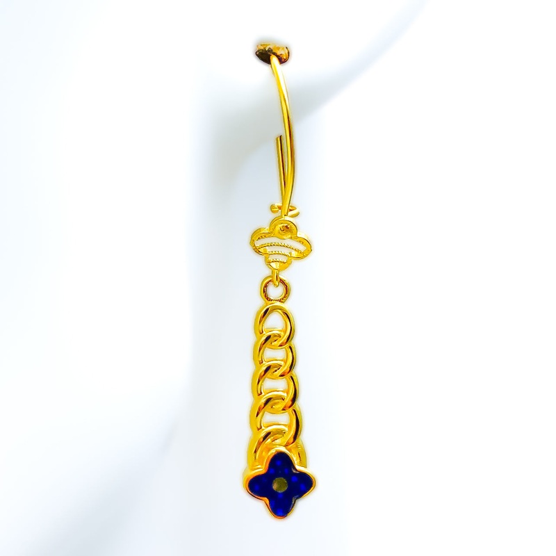 Exuding elegance and intricate craftsmanship, these 21k yellow gold hanging earrings showcase a beautifully ornate design with a radiant finish. Weighing 3.9 grams, their polished gold surface enhances the delicate detailing, creating a refined and luxurious appeal. Measuring 1.8 inches in length, these earrings offer graceful movement, making them perfect for both special occasions and everyday sophistication. Secured with a comfortable hook-back post, they ensure ease of wear and a secure fit. Designed for those who appreciate timeless beauty with a touch of grandeur, these exquisite earrings are a stunning addition to any fine jewelry collection.