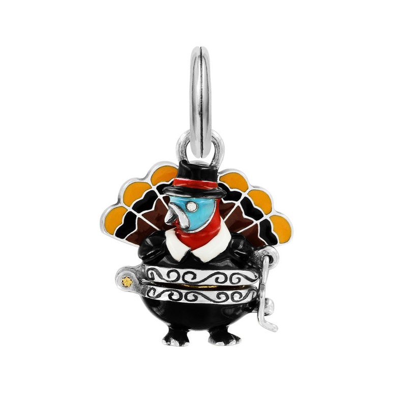 This little turkey charm, with his hand-enameled plumage, wears a Pilgrim hat and is dressed in his Thanksgiving best! A fun addition to your fall-themed charm jewelry. Inside a little gold heart gleams. Artisan details and impeccable craftsmanship are among the many hallmarks of our Treasures.