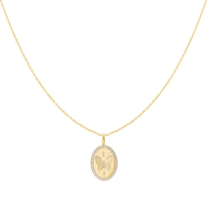 Embrace colour, light, and playful styling with Sunny Sparkler. Perfect for casual outings and relaxed days, this necklace features a engraved butterfly on an oval pendant, adding a dreamy and romantic touch. Layer it with other necklaces or wear it alone,