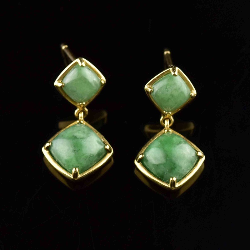These stunning vintage earrings boast natural green jade cabochons in a 9k gold geometric mounting. The jade stones are open-backed, revealing charming natural inclusions. A perfect fashion statement that packs a punch!Video available here...https://youtub