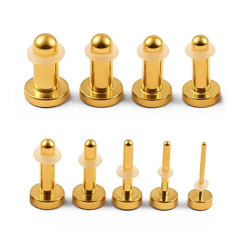 These single flare plugs are made from gold PVD coated 316L stainless steel. They have a wearable area of 1/4" between the o-ring and flare. Two o-rings are included, but they may be either black or clear color. Choose your size below.