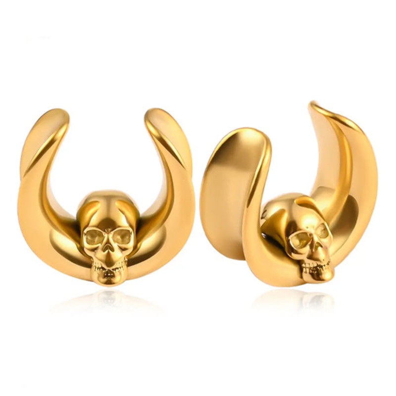 These skull saddle spreaders are made from gold PVD coated 316L stainless steel. We recommend buying these one size smaller than the double flare plugs you normally wear. Choose your size below.