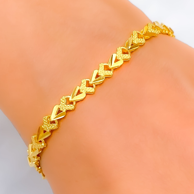 Crafted in 22k yellow gold and weighing 7.1 grams, this 7.5-inch bracelet features a refined frosted finish that gives the surface a soft, satin-like texture with subtle shimmer. The warm golden tone is enhanced by the matte detailing, offering a graceful