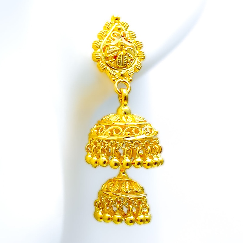 Golden Intricate Leaf Adorned 22k Gold Jhumki Earrings