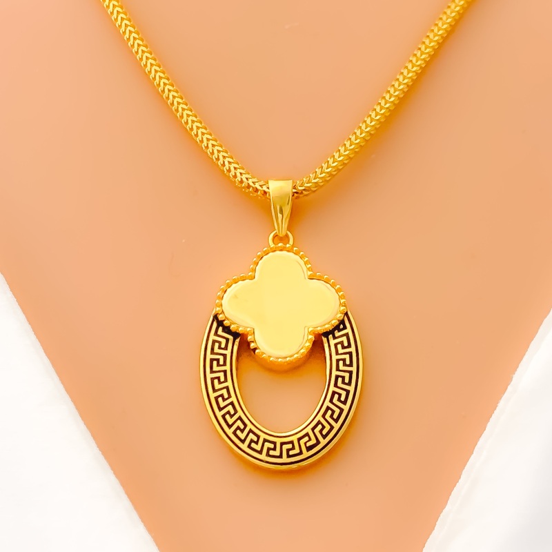 Beautifully crafted in 21k yellow gold, this pendant radiates a gorgeous clover-inspired charm. Weighing 3.8 grams, its polished finish accentuates the graceful curves of the four-leaf design. Measuring 1.3 inches in length, it offers a balanced blend of e