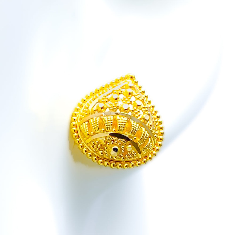 These elegant 22k gold earrings, weighing 4.8 grams, showcase a refined drop-shaped design that radiates timeless beauty. The lustrous yellow gold finish enhances their intricate craftsmanship, creating a sophisticated yet graceful appeal. Measuring 0.6 inches in diameter, these earrings offer a delicate yet eye-catching presence, secured with a sturdy screw-back post for a comfortable and secure fit. A perfect blend of elegance and charm, these earrings are a stunning addition to any fine jewelry collection.