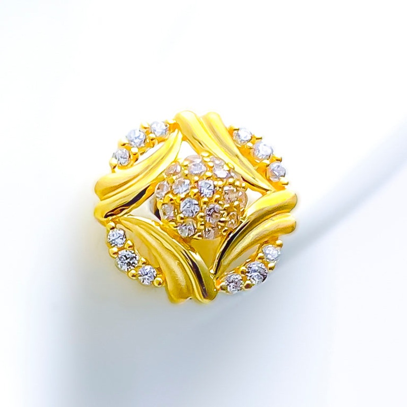 These 22k yellow gold earrings, weighing 5.3 grams, feature a gorgeous leaf design, intricately adorned with cubic zirconia. The earrings, styled as tops, have a diameter of 0.5 inches, perfect for adding an exquisite touch to any look. The screw-back post