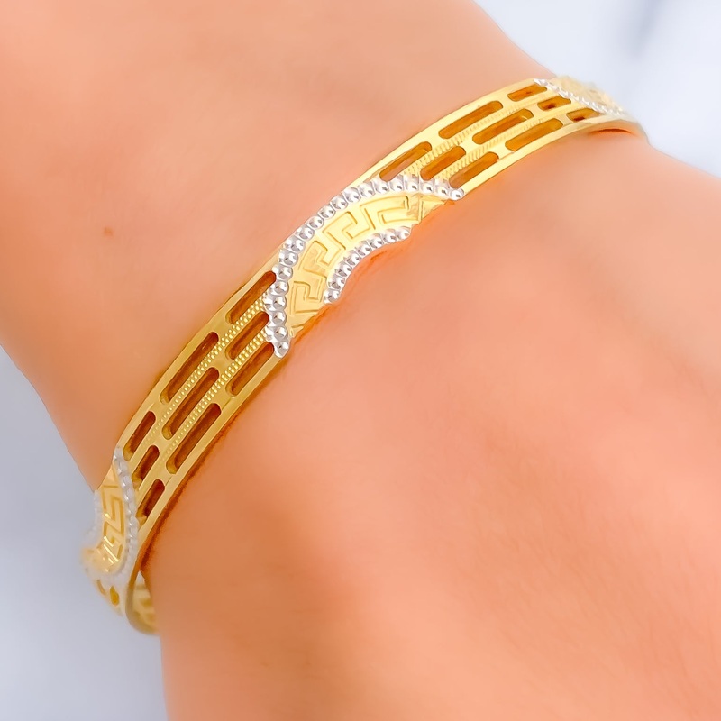 This 22k gold bangle, with a weight of 16.0 grams, captivates with its gorgeous semi-circle adornments in a harmonious blend of yellow and white gold. The design adds a geometric elegance to the bangle, enhancing its visual appeal. Sized at 2.6 and featuri