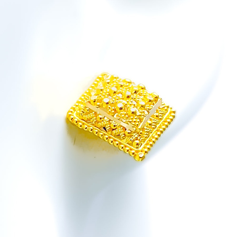 These elegant 22k gold earrings, weighing 5.4 grams, feature a refined square design adorned with delicate beaded detailing for a sophisticated touch. The radiant yellow gold finish enhances their intricate craftsmanship, creating a timeless yet contemporary appeal. Measuring 0.75 inches in diameter, these earrings offer a balanced and graceful presence, secured with a sturdy screw-back post for reliable and comfortable wear. A seamless blend of elegance and artistry, these earrings make a stunning addition to any fine jewelry collection.
