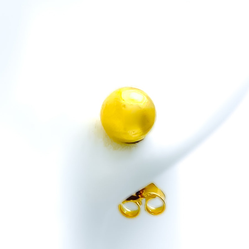 These graceful glossy orb top earrings, finely crafted from 22k gold and weighing 3.4 grams, radiate with a polished yellow gold finish. The earrings, each with a diameter of 0.25 inches, offer an elegant, understated touch, perfect for adding a dash of so