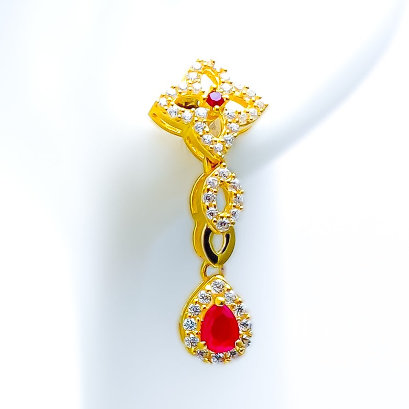 Crafted in 22k yellow gold and weighing 4.2 grams, these hanging earrings showcase a graceful design accented with sparkling cubic zirconia stones. Measuring 1 inch in length, they add a touch of timeless elegance to both special occasions and everyday att