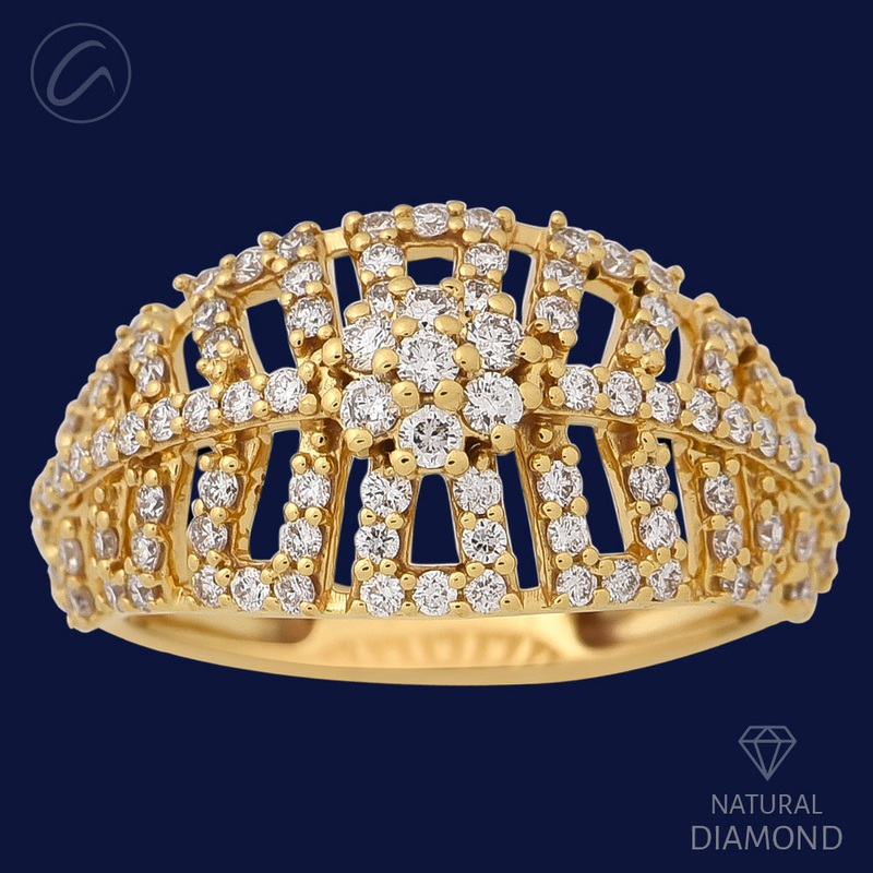 Embrace elegance with our Graduating Striped 18K Gold + Diamond Ring. Crafted in exquisite 18k yellow gold, weighing 3.6 grams, this remarkable piece showcases a stunning array of round brilliant-cut diamonds. With a total diamond weight of 0.85ct, radiati