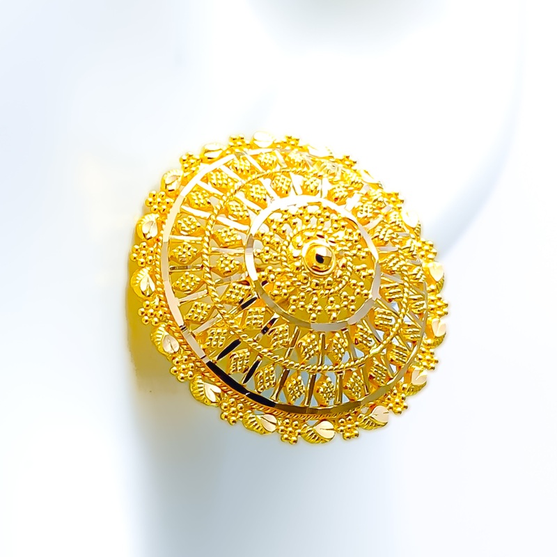 Refined and elegant, these 22k gold earrings embody timeless sophistication with their radiant yellow gold finish and exquisite craftsmanship. Weighing 8.6 grams, they offer a luxurious feel while maintaining a graceful design. With a 0.9-inch diameter, these beautifully crafted tops create a bold yet tasteful statement, perfect for both formal occasions and everyday elegance. Secured with a sturdy screw-back post, they provide a comfortable and secure fit. Designed for those who appreciate classic beauty with a touch of grandeur, these earrings are a stunning addition to any fine jewelry collection.