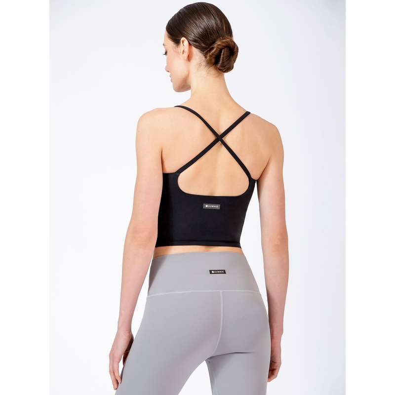 Made with NIETEL + Engineered by AUMNIE + High performance stretch fabric + Elastane blend for soft luxe comfortDescriptionCropped V-neck tank with open back Cross back straps to keep shoulder straps in placeBuilt-in shelf bra with removable soft cupsDesig