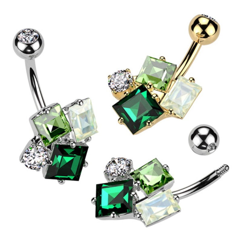 Green Cluster Belly Ring 14g – 3/8″ long (10mm) Clear/Green/Aurora Borealis Gold Stainless