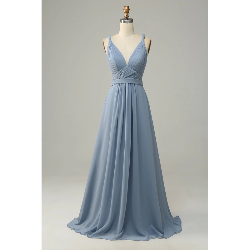 Be the first to review “Grey blue deep V-neck A-line long bridesmaid dress”