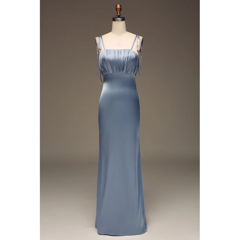 Be the first to review “Grey blue slim shoulder strap tight satin pleated bridesmaid dress”