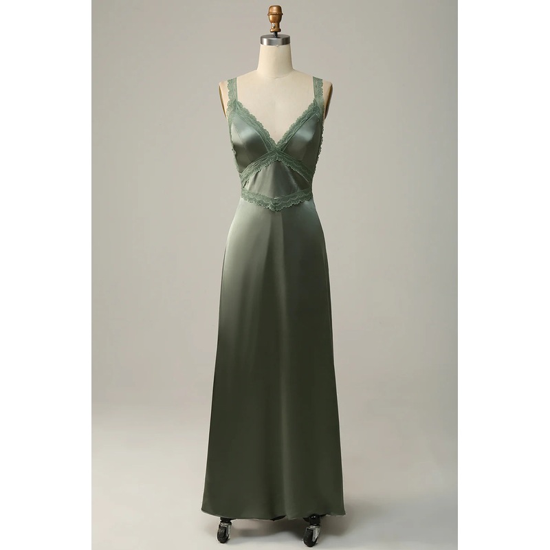Grey green tight thin shoulder strap back tied satin bridesmaid dress