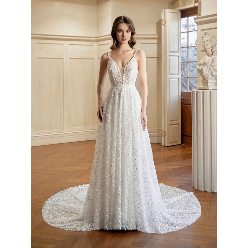Grey white A-line thin shoulder strap V-neck extra long lace wedding dress