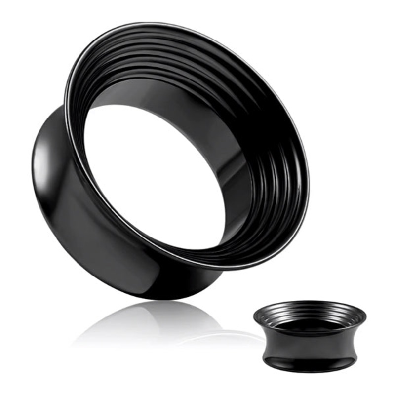 These double flare grooved mayan tunnels are made from black PVD coated 316L stainless steel. The mayan design has a larger front flare. They have a wearable area of 5/16″ between flares. Choose your size below.