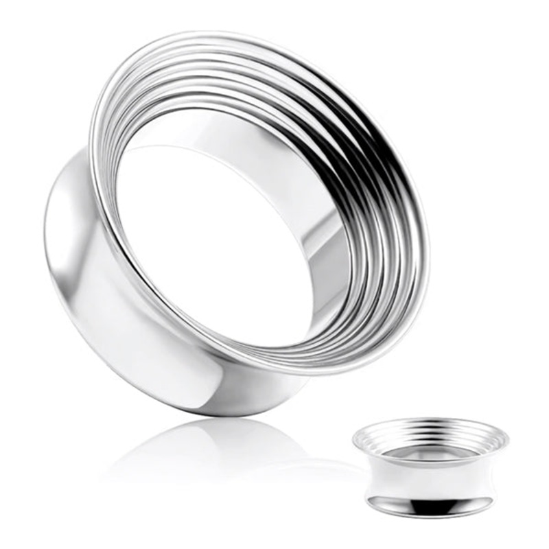 These double flare grooved mayan tunnels are made from 316L stainless steel. The mayan design has a larger front flare. They have a wearable area of 5/16″ between flares. Choose your size below.