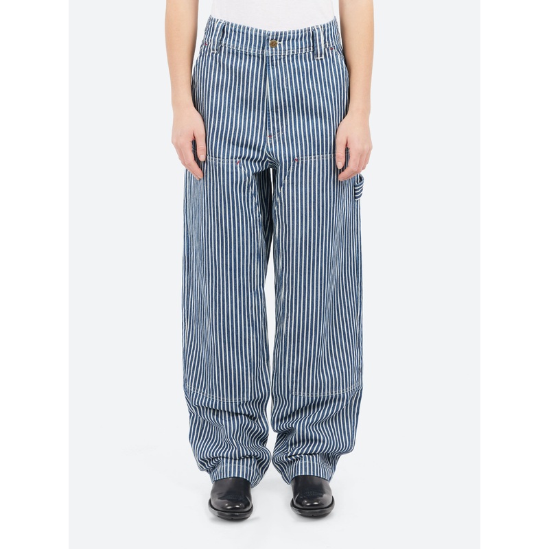 These carpenter jeans from A.P.C. are crafted from heavyweight workwear-style cotton, featuring bold blue and white stripes that give them a distinctive look. With a straight cut and loose fit, they offer a comfortable, relaxed silhouette, sitting at a mid