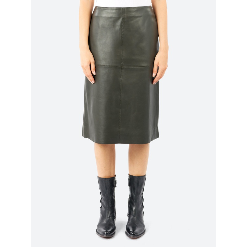The Gwen Skirt by Soeur is a timeless wardrobe piece elevated by luxurious material and thoughtful tailoring. Crafted from lambskin leather, it features a slightly flared straight cut that offers both structure and fluidity, hitting just at the knee for a