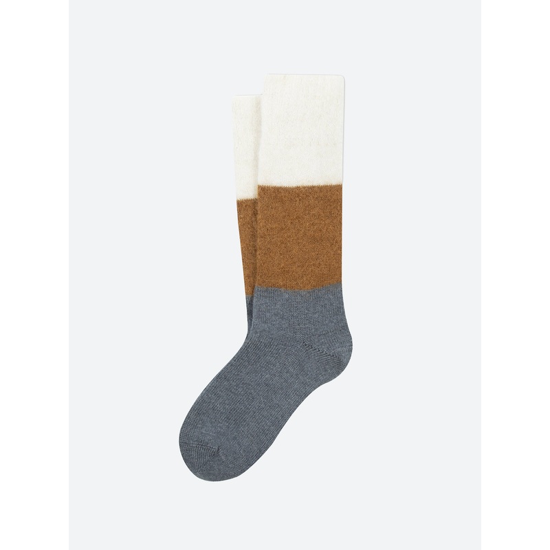 Solid colour cashmere-wool blend on the foot, colourblock soft mohair at the cuff.Crew length socksColourblockedMade in ItalyMaterialsFabric Content: 26% wool, 25% polyamide, 22% mohair, 13% cashmere, 12% viscose, 2% elastaneSize GuideOne size fits most.EU