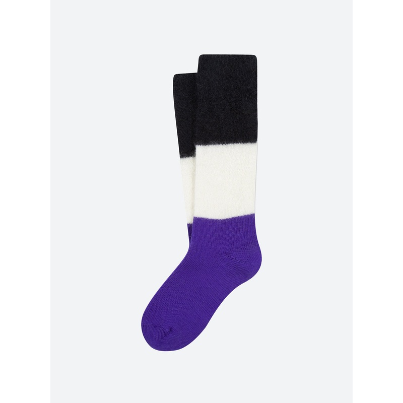 Solid colour cashmere-wool blend on the foot, colourblock soft mohair at the cuff.Crew length socksColourblockedMade in ItalyMaterialsFabric Content: 26% wool, 25% polyamide, 22% mohair, 13% cashmere, 12% viscose, 2% elastaneSize GuideOne size fits most.EU